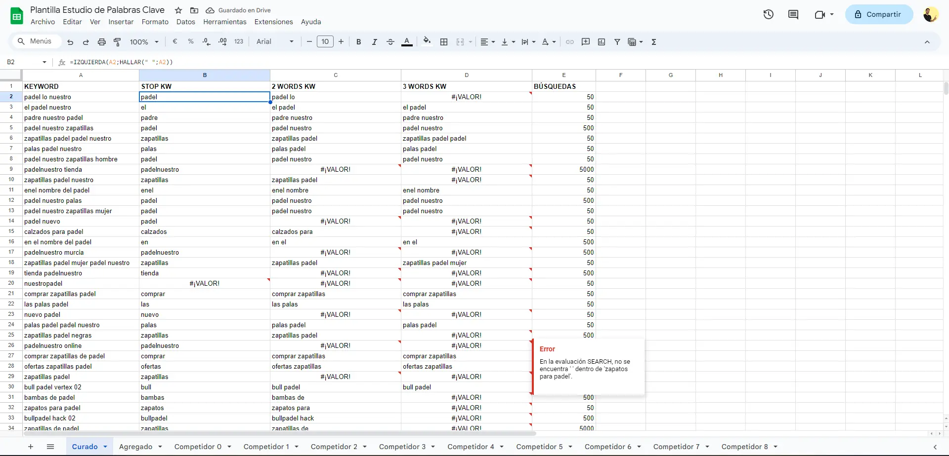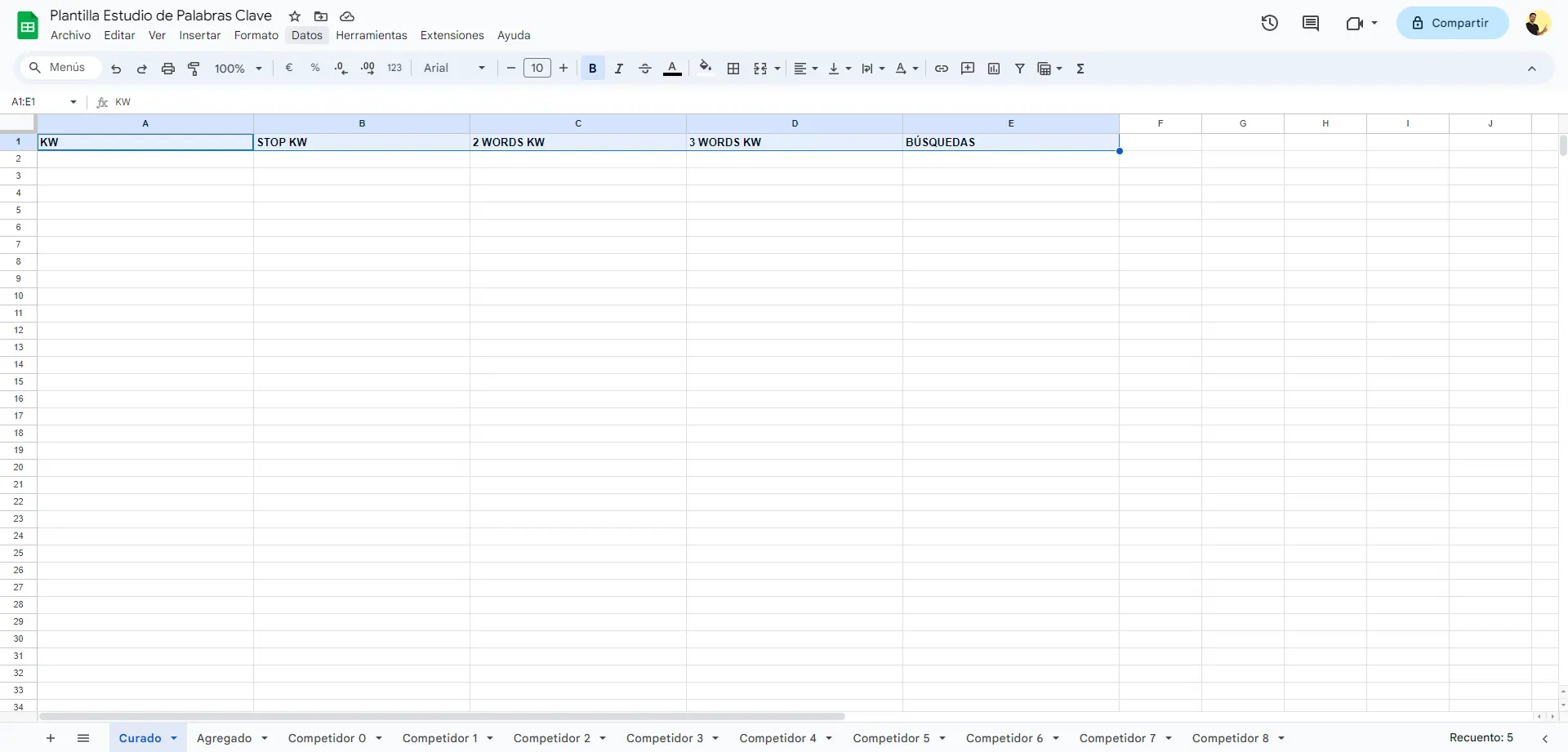 En una hoja vacía que llamaremos “Curado”, necesitaremos 5 columnas. Las llamaremos “Keyword”, “Stop kw”, “2 words”, “3 words”, “Búsquedas”.