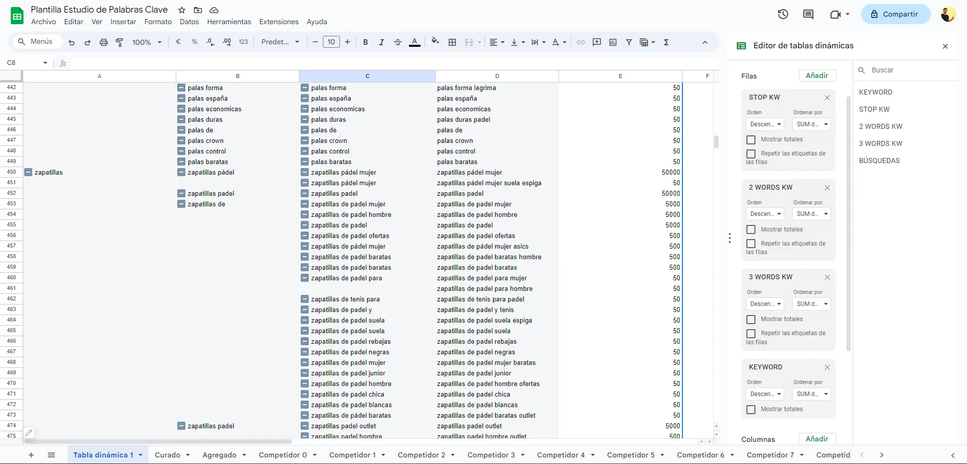 En Filas añadimos en este orden: “Stop Kw”, “2 Words“, “3 Words“, “Keyword“ y en Valores añadimos “Búsquedas“.