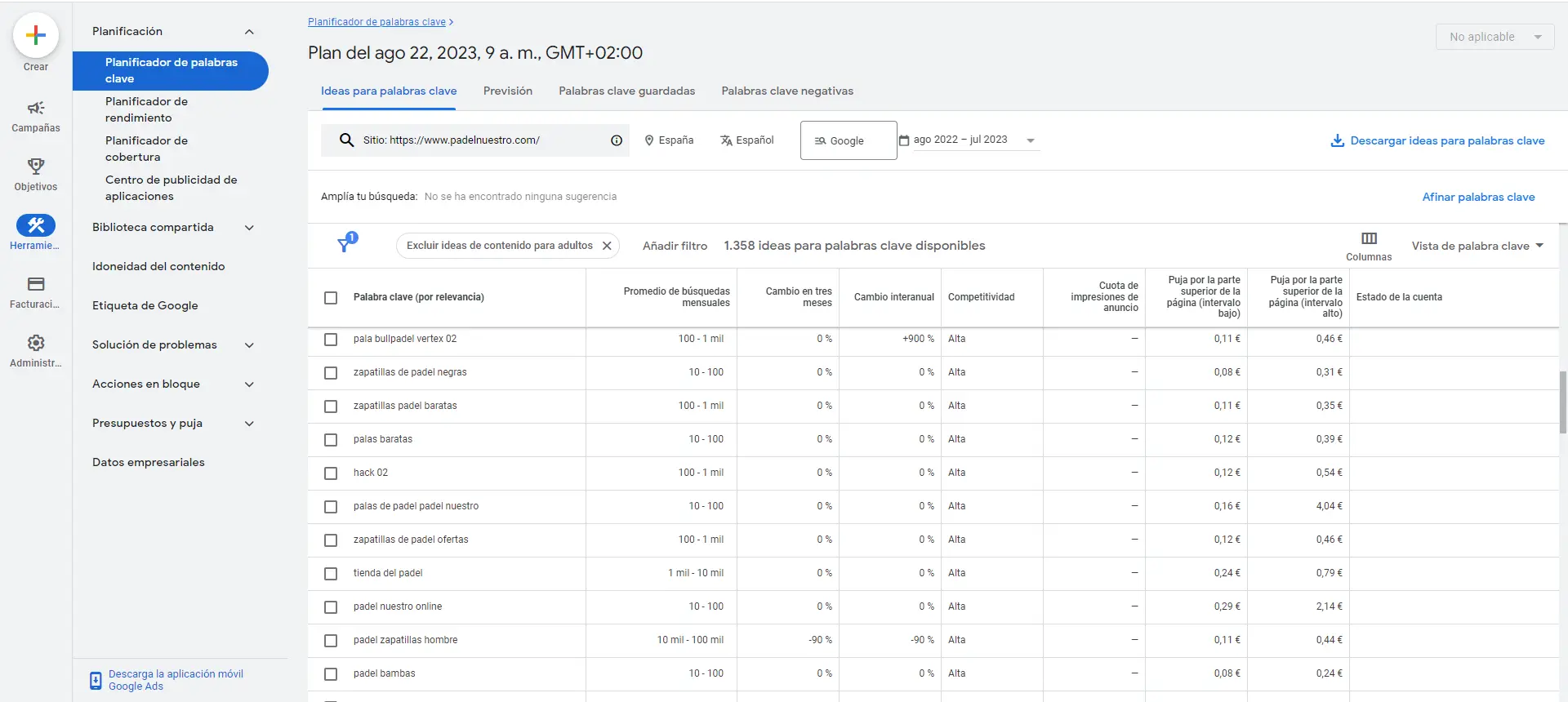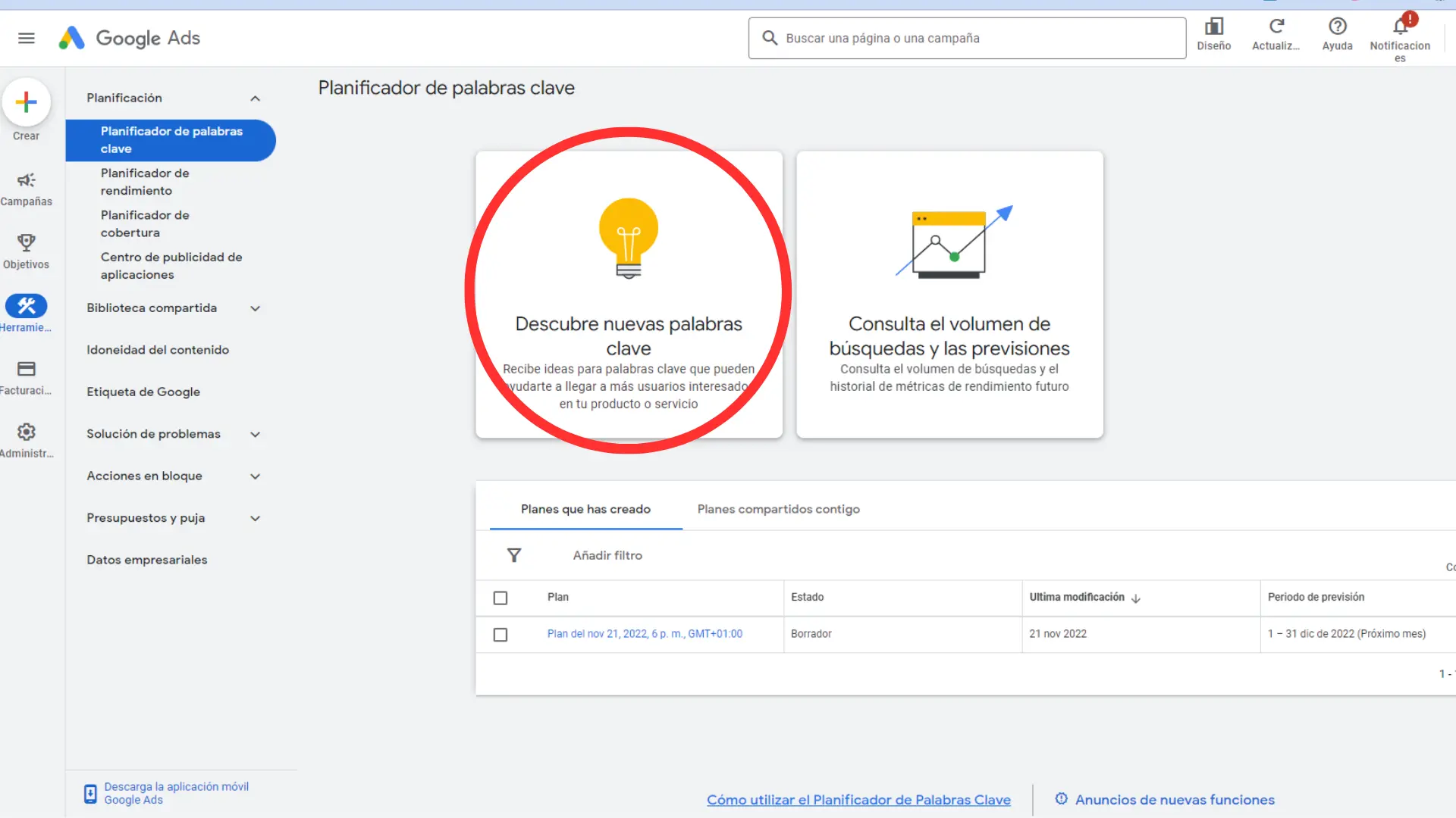 Después, vamos a entrar a nuestra cuenta de Google Ads (haz clic aquí) y seguir estos pasos para cada uno de los competidores que hayamos elegido: