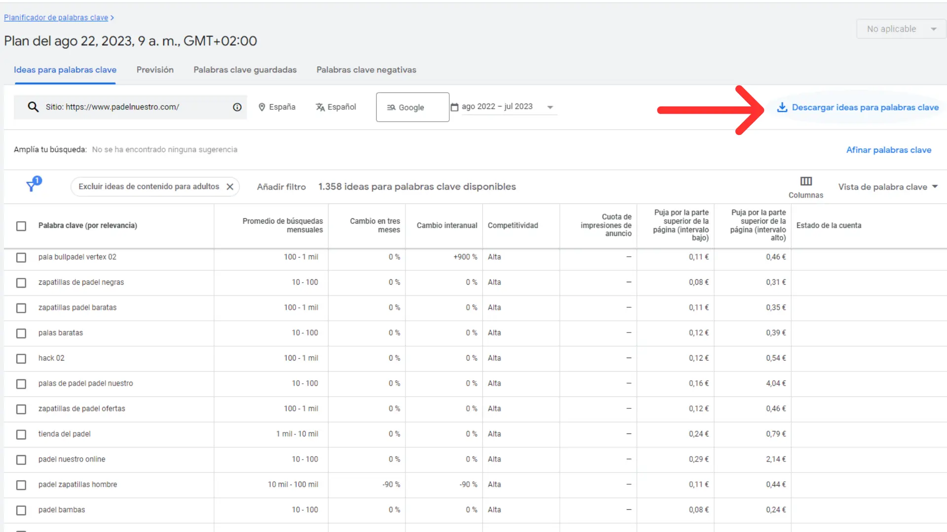 Dale un vistazo rápido para comprobar que son palabras clave útiles y alineadas con tu negocio. Como mínimo puedes establecer 100 ideas de palabras clave disponibles. Si hay menos, descarta a este competidor.