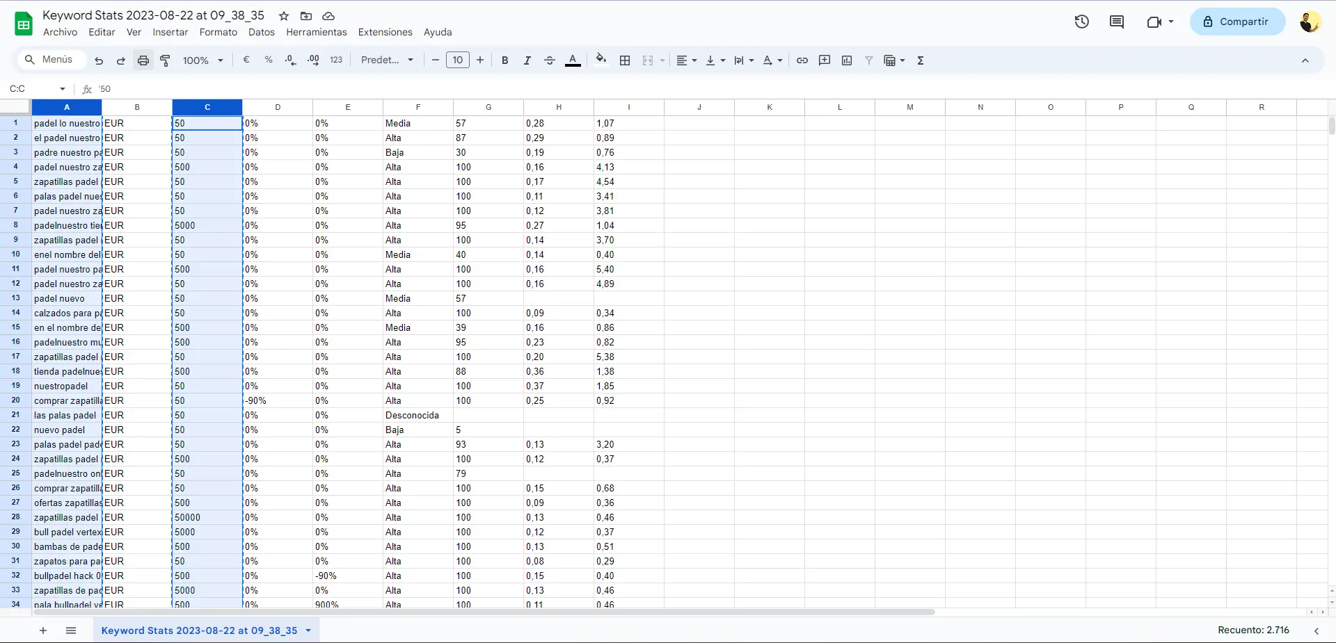Con esto nos aparecerá la keyword desglosada por partes, ahora solo debemos expandir la fórmula hasta la última celda abajo a la derecha de esta hoja.