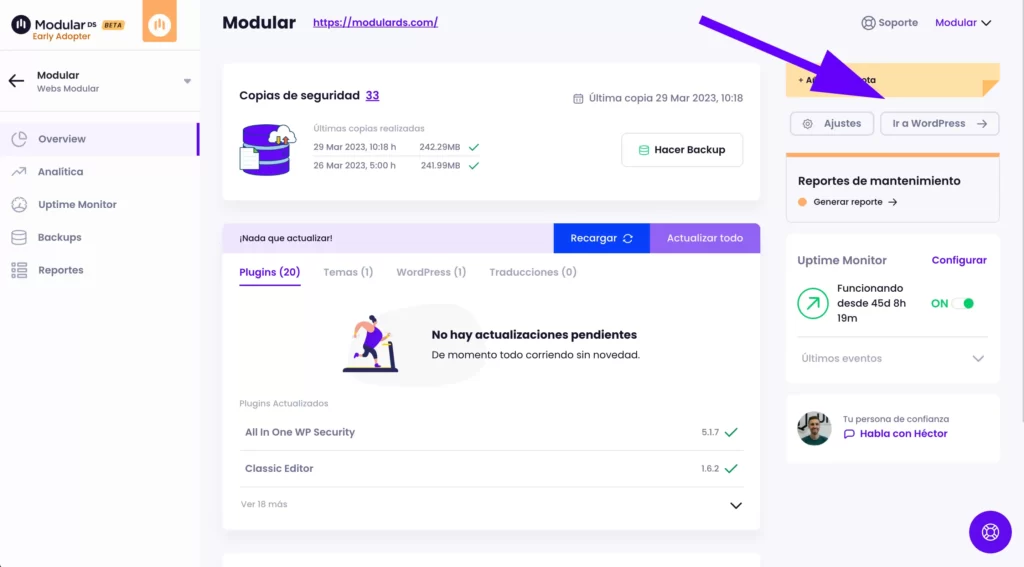 Dentro del panel de cada web en Modular podrás llevar a cabo todas las actualizaciones de tu web. Incluyendo plugins, temas, versiones de WordPress y traducciones.