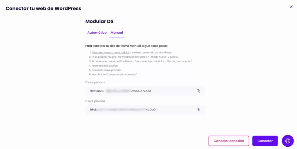 - Conectar la web de manera manual. Si prefieres instalar tú el plugin de Modular desde el repo oficial, una vez que lo activas, simplemente tendrás que añadir las dos claves que te indica para poder realizar la conexión de la web en “Herramientas > Modular – Gestor de conexión”.