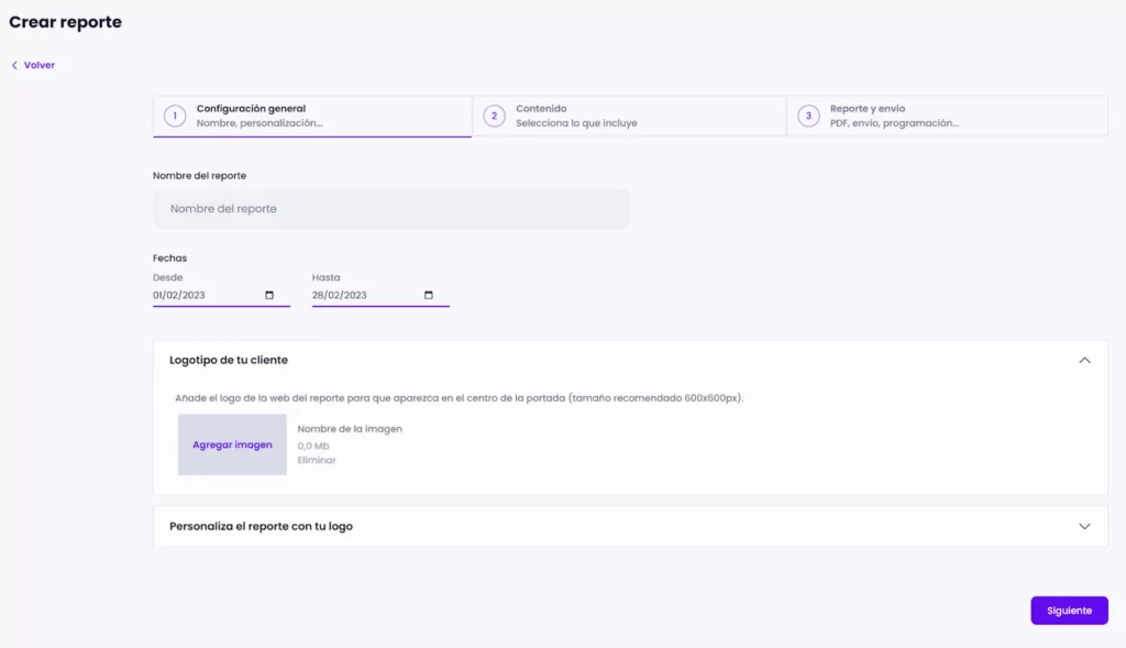 Una vez dentro podrás personalizar las fechas, nombre del reporte y añadir el logo de tu cliente y tu logo para quitar la marca blanca de Modular (si eres PRO).
