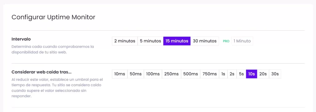 Con Modular puedes activarlo con tu cuenta gratuita cada 15 o 30 minutos (y hasta cada 2 minutos con tu cuenta PRO) y elegir a partir de qué tiempo de respuesta quieres que se considere la web como caída.