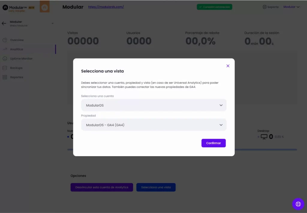 Al igual que el punto anterior y pensado para poder ver unas estadísticas básicas de tu web, puedes conectar tu cuenta de Google a Modular para consultas los datos de Analytics.