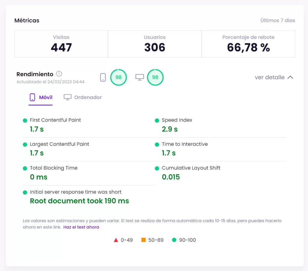 Si pasamos ahora a la parte de las métricas de la web y otros aspectos importantes que puedan ayudarnos a aportar valor a nuestros clientes, comenzamos con el análisis de rendimiento.