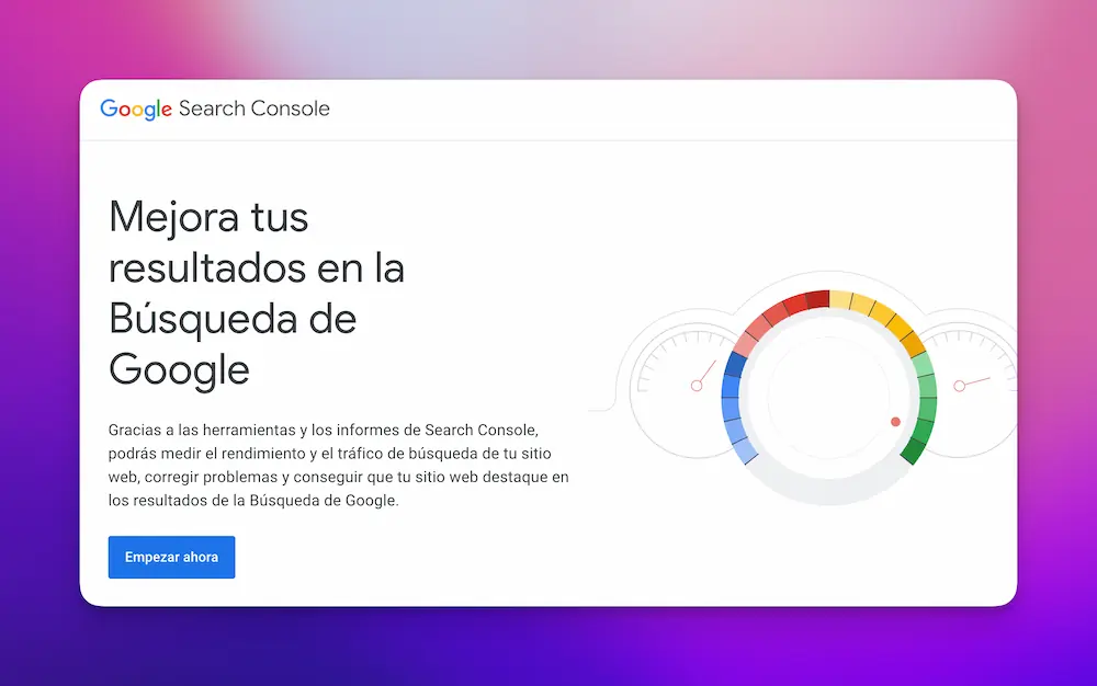 Una vez que tengas tu cuenta de Google, ve a Google Search Console y haz clic en “Empezar ahora”.