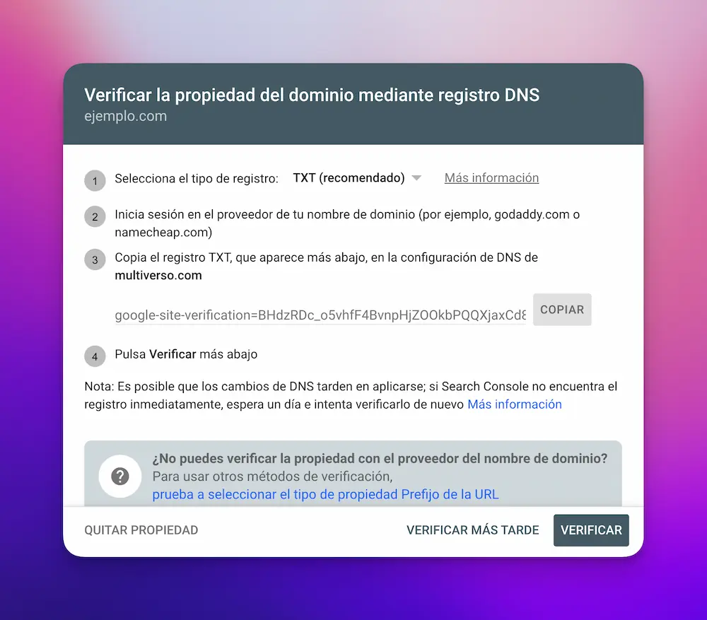 En este caso Google Search Console te proporciona un código de verificación que debes agregar como un registro TXT en la configuración DNS de tu dominio.