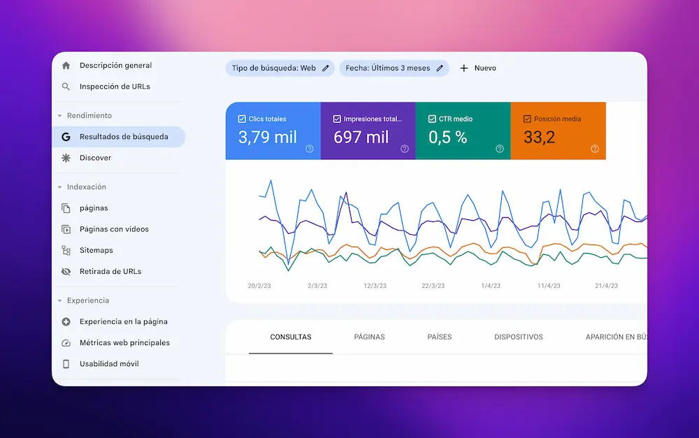 - El rendimiento de tu web en las búsquedas 📊: Te dice cómo los usuarios estás encontrando tu sitio en Google. ¿Qué palabras están buscando? ¿Qué páginas les gustan más? ¿De dónde son?