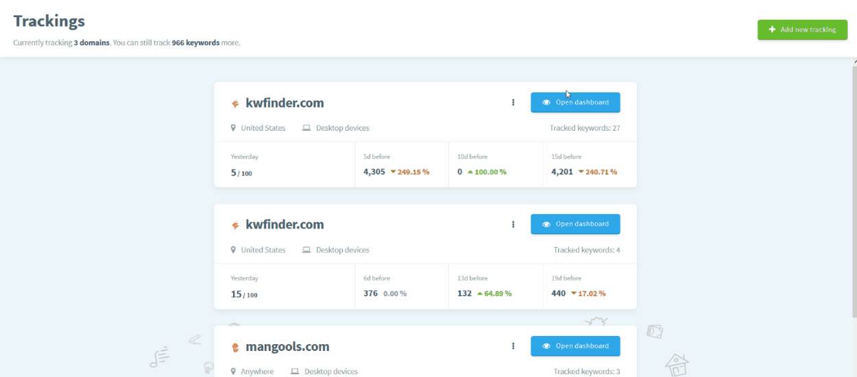 SERPWatcher sigue esta misma filosofía en cuanto a la interfaz, y también como complemento a KWFinder para monitorizar las listas de keywords que construyas en ella.